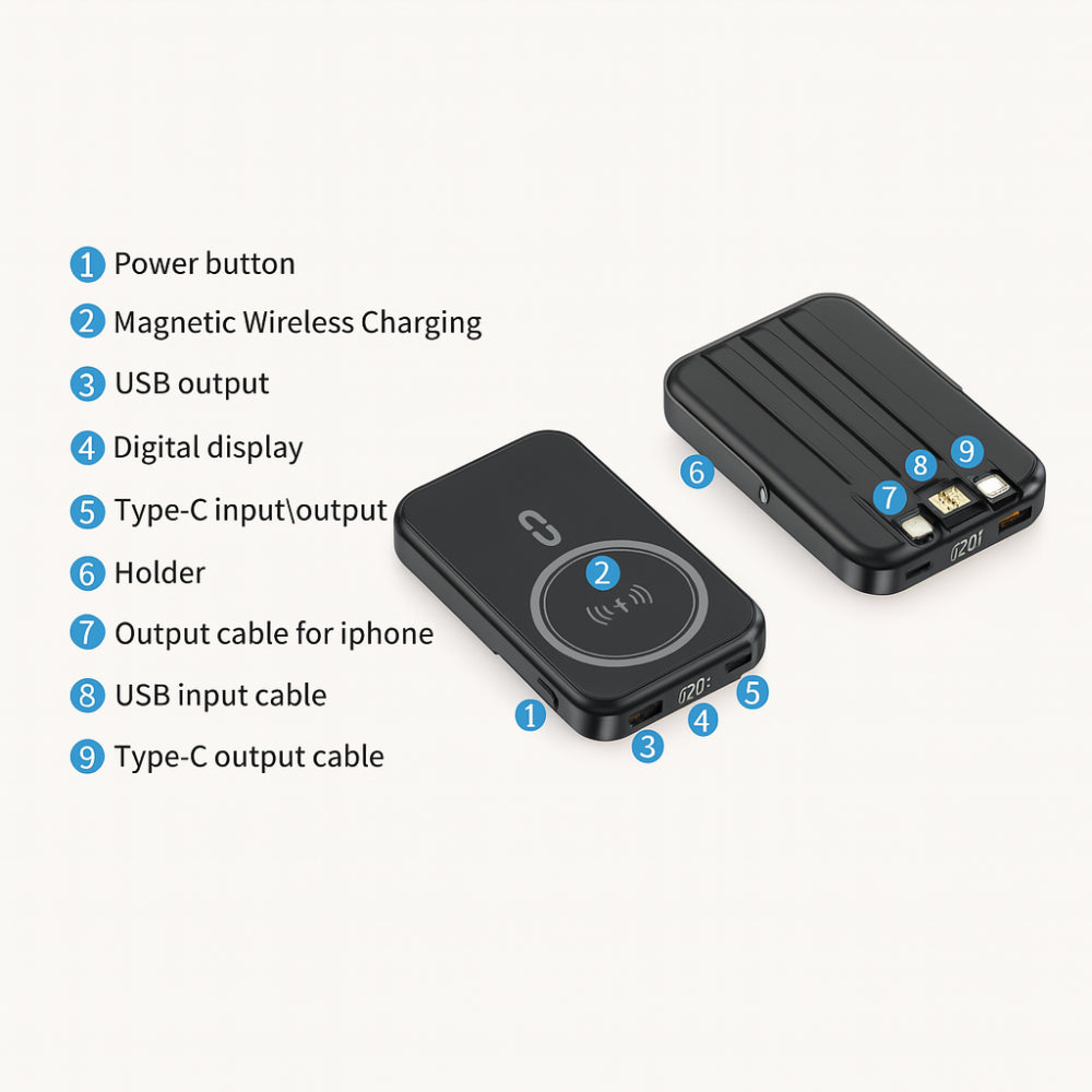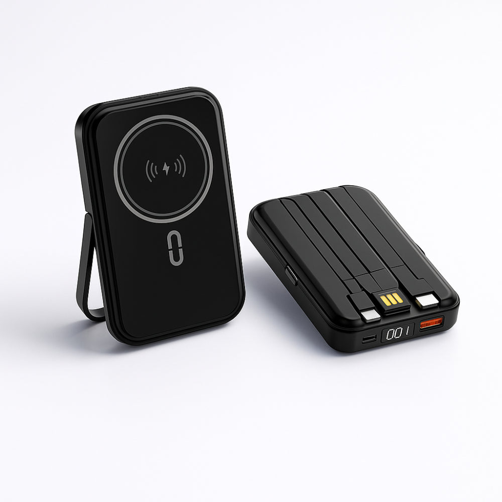 🔋 Magnetic Wireless Power Bank – Integrates MagSafe magnetic technology for seamless attachment to iPhone 12–16 series. Also functions as a Qi-enabled wireless power bank for Samsung and other compatible devices.